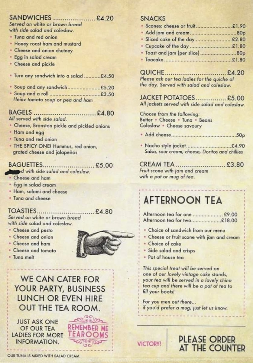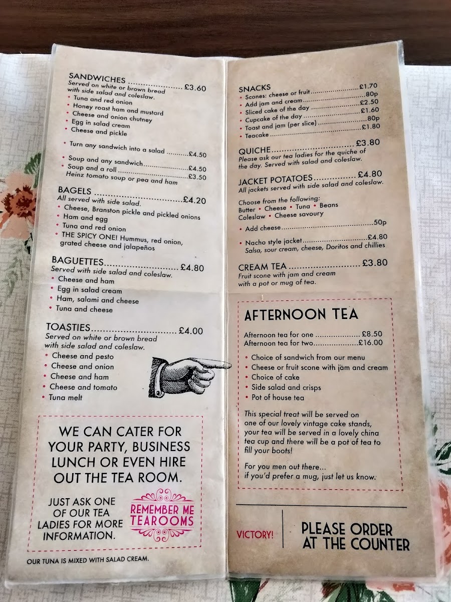 From a reviewer’s perspective, the menu at Remember Me Tea Rooms offers a comforting selection of traditional light bites and classic tea room favourites at reasonable prices, with highlights including sandwiches such as Honey Roast Ham And Mustard, Cheese And Onion Chutney, Egg In Salad Cream, Cheese And Pickle, and the option of Soup And Any Sandwich for a heartier choice. The snacks section features freshly baked treats like Scones and Sliced Cake Of The Day, which pair perfectly with tea. For a more complete experience, the Afternoon Tea For One is a charming option that reflects the traditional British tea room style. The menu also includes baguettes like Cheese And Ham and Egg In Salad Cream, as well as toasties such as Cheese And Pesto, Cheese And Onion, Cheese And Ham, and Cheese And Tomato, offering simple but satisfying flavours. Additional items like Cheese Or Fruit Scones further round out the menu, making it a pleasant spot for a relaxed, affordable lunch or afternoon treat.